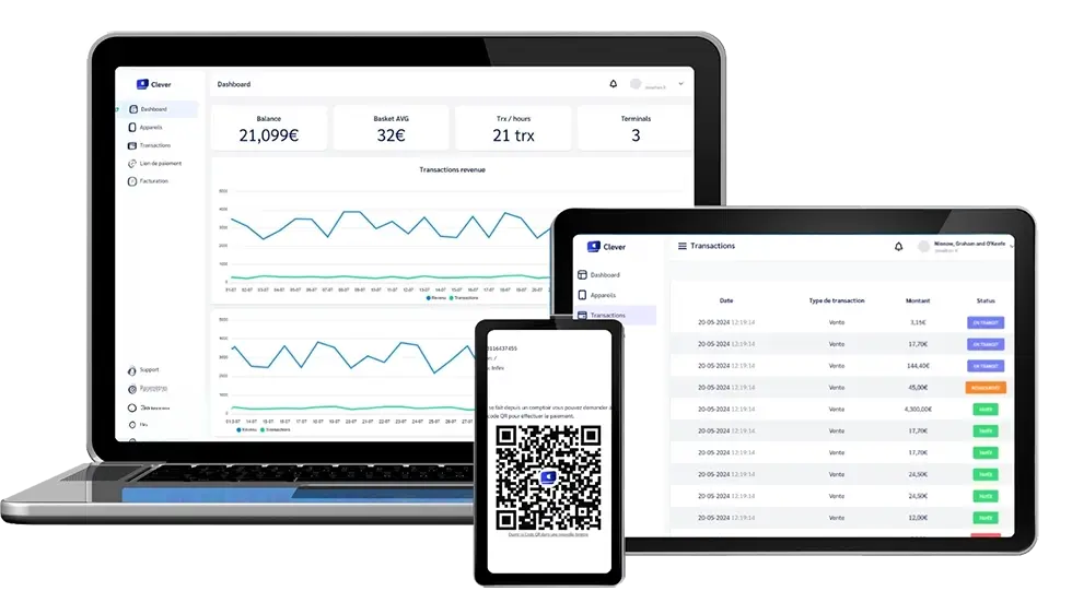 Grâce au Portail Clever, gérez un ou plusieurs terminaux de paiement simultanément en un seul endroit. Exploitez les données centralisées pour une analyse approfondie du comportement de vos clients.
